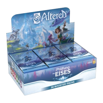 Beginnt euren Aufstieg in Prüfung des Eises und stellt euch den Gefahren des Cais Adarra, einer steilen Gebirgskette, die in ewigen Winter gehüllt ist. Rüstet euch, sammelt eure Kräfte und führt eure Expeditionen durch eine feindliche Umgebung aus Eis und Schnee. Bahnt euch einen Weg zum Herzen des Berges und sucht nach Antworten, die im Eis eingeschlossen sind. Altered ist ein innovatives Trading Card Game, das in einem reichhaltigen, farbenfrohen und modernen Fantasy-Universum spielt. Gestalte dein eigenes Abenteuer, wähle eine Fraktion und führe deine Expeditionen durch eine sich ständig verändernde Welt. Erforsche die Welt von Altered, sammle seltene und einzigartige Karten und sei der Erste, der entdeckt, was das Universum von Altered für dich bereithält! Die Booster Box enthält 36 Play Booster. Jedes Booster-Pack enthält 1 Heldenkarte, 3 seltene Karten, 8 häufige Karten und 1 Marken-Karte (75 %-Wahrscheinlichkeit) oder 1 Foil-Karte (25 %-Wahrscheinlichkeit). Eine seltene Karte kann durch eine einzigartige Karte ersetzt werden (12,5 %-Wahrscheinlichkeit).